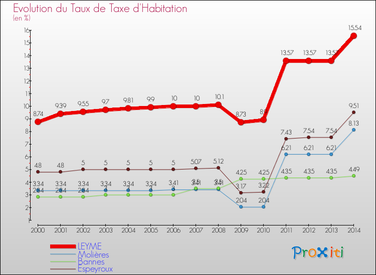 A Leyme, le taux de taxe d'habitation a ainsi augmenté de 77.8 % entre 2000 et 2014.