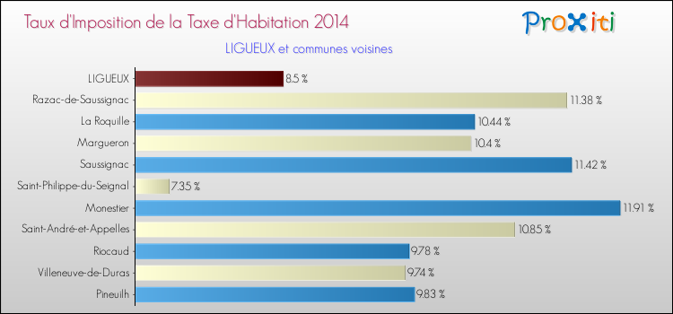 En 2014, le taux de la taxe d'habitation vôté par le conseil municipal de Ligueux était de : 8.5 %.