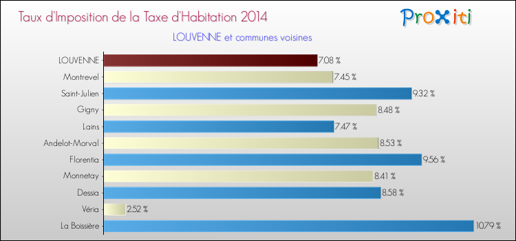 Vous trouverez ci-dessous des graphiques qui vous permettent de situer le taux de la taxe d'habitation de Louvenne par rapport aux communes voisines.