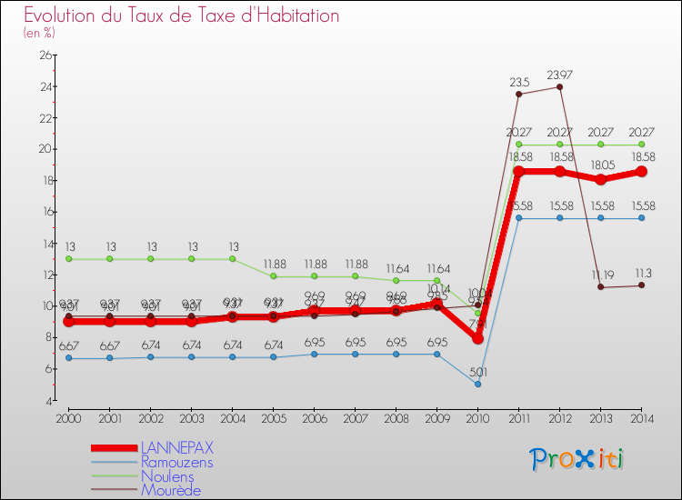 Pendant la même période, les communes françaises similaires à Lannepax, ont vu leur taux de taxe d'habitation augmenter de 73.19 % en moyenne entre 2000 et 2014.
