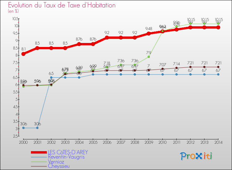 A Les Côtes-d'Arey, le taux de taxe d'habitation a ainsi augmenté de 22.22 % entre 2000 et 2014.