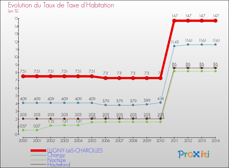 A Lugny-lès-Charolles, le taux de taxe d'habitation a ainsi augmenté de 95.74 % entre 2000 et 2014.