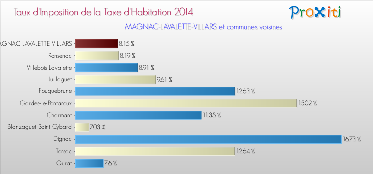 Vous trouverez ci-dessous des graphiques qui vous permettent de situer le taux de la taxe d'habitation de Magnac-Lavalette-Villars par rapport aux communes voisines.