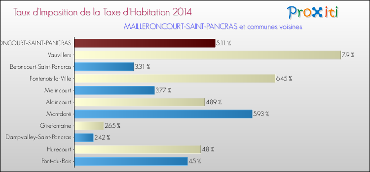 En 2014, le taux de la taxe d'habitation vôté par le conseil municipal de Mailleroncourt-Saint-Pancras était de : 5.11 %.