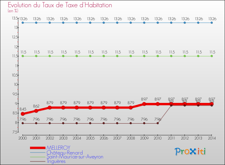 A Melleroy, le taux de taxe d'habitation a ainsi augmenté de 6.15 % entre 2000 et 2014.