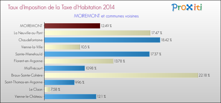 En 2014, le taux de la taxe d'habitation vôté par le conseil municipal de Moiremont était de : 12.49 %.