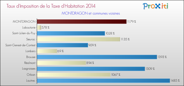 En 2014, le taux de la taxe d'habitation vôté par le conseil municipal de Montdragon était de : 11.79 %.