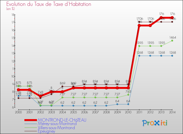 A Montrond-le-Château, le taux de taxe d'habitation a ainsi augmenté de 113.08 % entre 2000 et 2014.