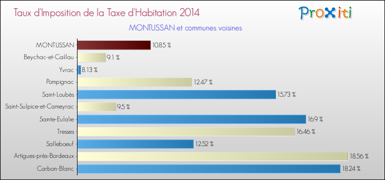 En 2014, le taux de la taxe d'habitation vôté par le conseil municipal de Montussan était de : 10.85 %.