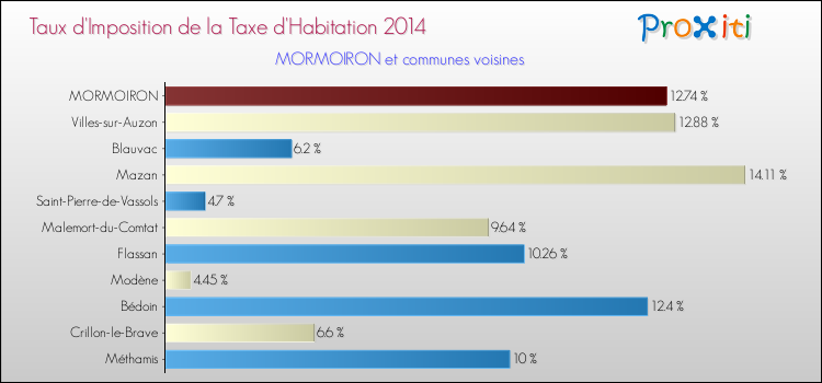 En 2014, le taux de la taxe d'habitation vôté par le conseil municipal de Mormoiron était de : 12.74 %.