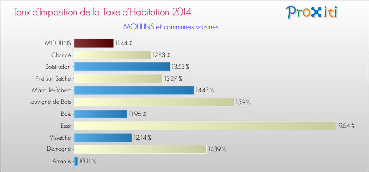 En 2014, le taux de la taxe d'habitation vôté par le conseil municipal de Moulins était de : 11.44 %.