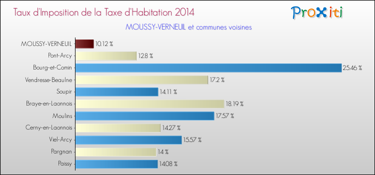 En 2014, le taux de la taxe d'habitation vôté par le conseil municipal de Moussy-Verneuil était de : 10.12 %.
