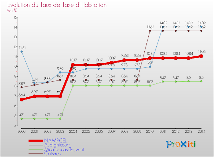 A Nampcel, le taux de taxe d'habitation a ainsi augmenté de 66.57 % entre 2000 et 2014.