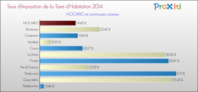 En 2014, le taux de la taxe d'habitation vôté par le conseil municipal de Nocario était de : 19.43 %.