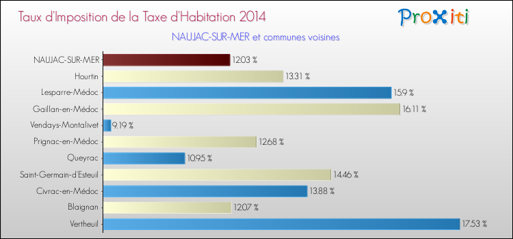 Vous trouverez ci-dessous des graphiques qui vous permettent de situer le taux de la taxe d'habitation de Naujac-sur-Mer par rapport aux communes voisines.