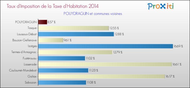 En 2014, le taux de la taxe d'habitation vôté par le conseil municipal de Pouydraguin était de : 8.57 %.
