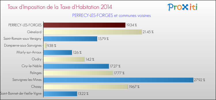 Vous trouverez ci-dessous des graphiques qui vous permettent de situer le taux de la taxe d'habitation de Perrecy-les-Forges par rapport aux communes voisines.