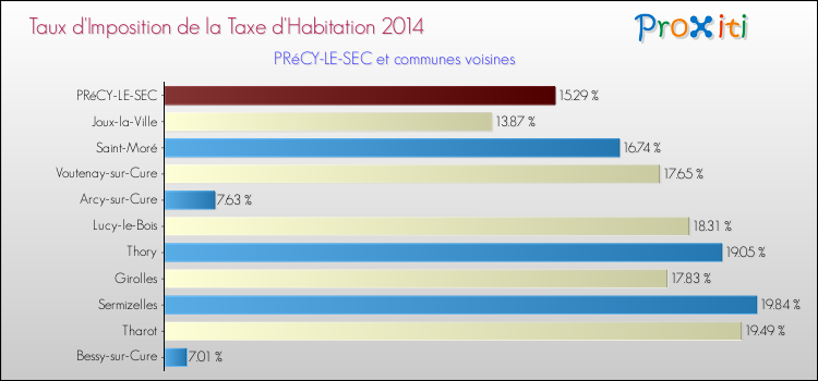 En 2014, le taux de la taxe d'habitation vôté par le conseil municipal de Précy-le-Sec était de : 15.29 %.