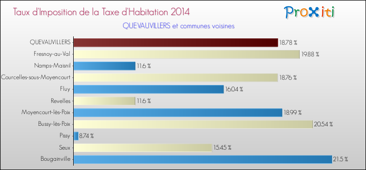 Vous trouverez ci-dessous des graphiques qui vous permettent de situer le taux de la taxe d'habitation de Quevauvillers par rapport aux communes voisines.