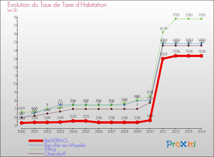 A Rémering, le taux de taxe d'habitation a ainsi augmenté de 150.19 % entre 2000 et 2014.