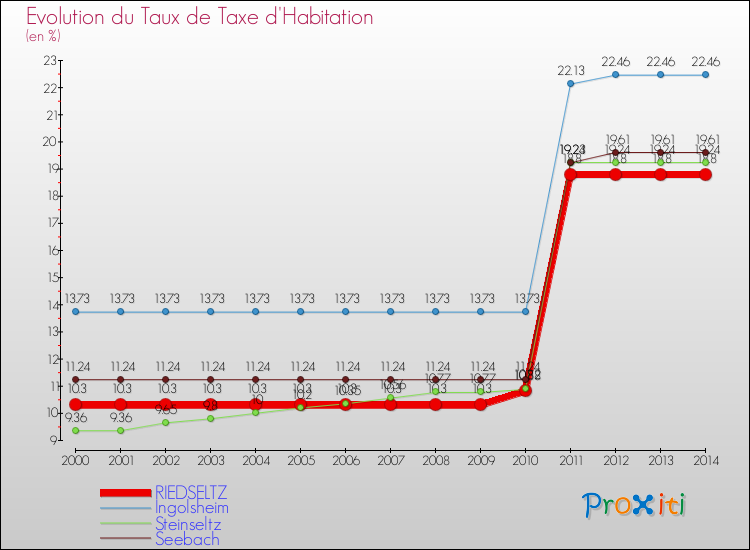 Le graphique ci dessous représente l'évolution du taux de la taxe d'habitation à Riedseltz depuis 2000.
