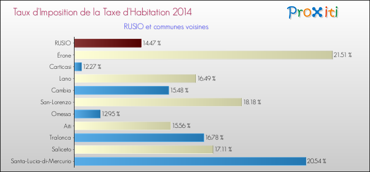 En 2014, le taux de la taxe d'habitation vôté par le conseil municipal de Rusio était de : 14.47 %.