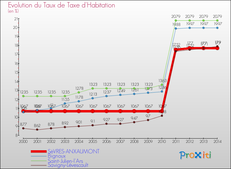 Pendant la même période, les communes françaises similaires à Sèvres-Anxaumont, ont vu leur taux de taxe d'habitation augmenter de 90.79 % en moyenne entre 2000 et 2014.