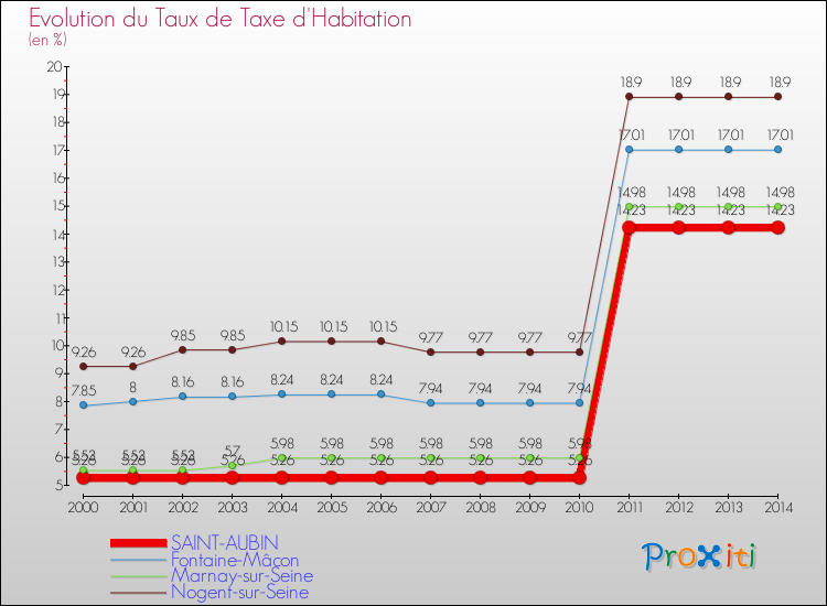 Pendant la même période, les communes françaises similaires à Saint-Aubin, ont vu leur taux de taxe d'habitation augmenter de 73.19 % en moyenne entre 2000 et 2014.