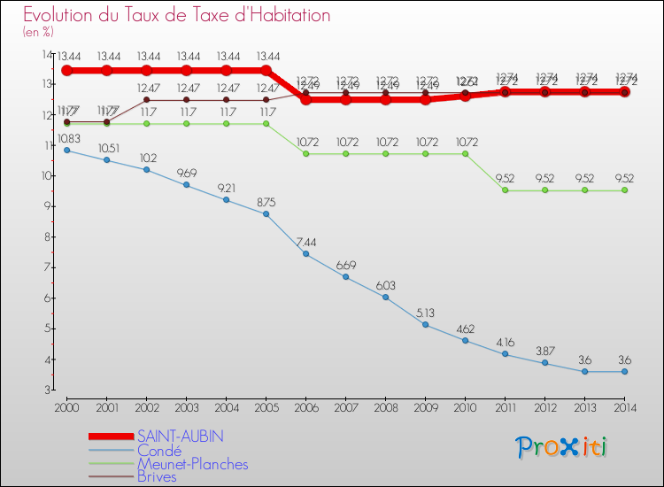 Comparaison des taux de la taxe d'habitation pour SAINT-AUBIN et les communes voisines de 2000 à 2014