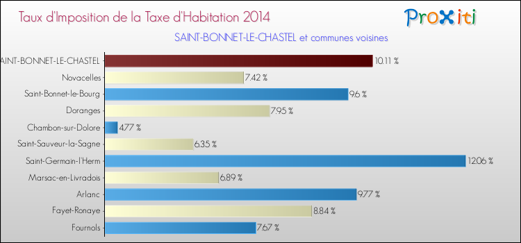 En 2014, le taux de la taxe d'habitation vôté par le conseil municipal de Saint-Bonnet-le-Chastel était de : 10.11 %.
