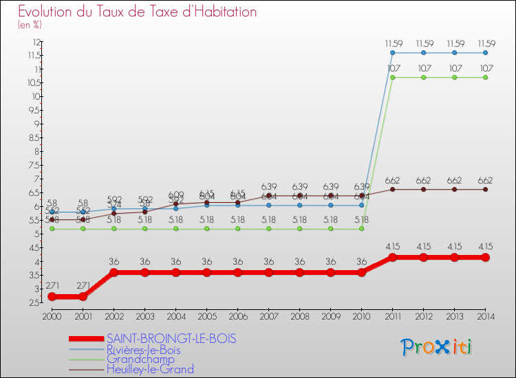 A Saint-Broingt-le-Bois, le taux de taxe d'habitation a ainsi augmenté de 53.14 % entre 2000 et 2014.