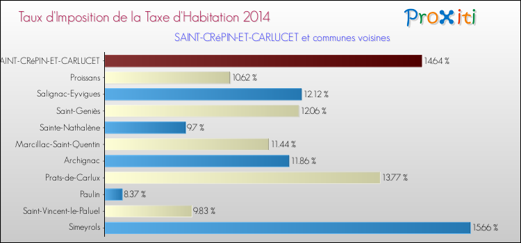 En 2014, le taux de la taxe d'habitation vôté par le conseil municipal de Saint-Crépin-et-Carlucet était de : 14.64 %.