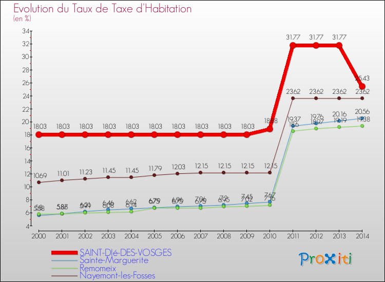 Pendant la même période, les communes françaises similaires à Saint-Dié-des-Vosges, ont vu leur taux de taxe d'habitation augmenter de 26.66 % en moyenne entre 2000 et 2014.