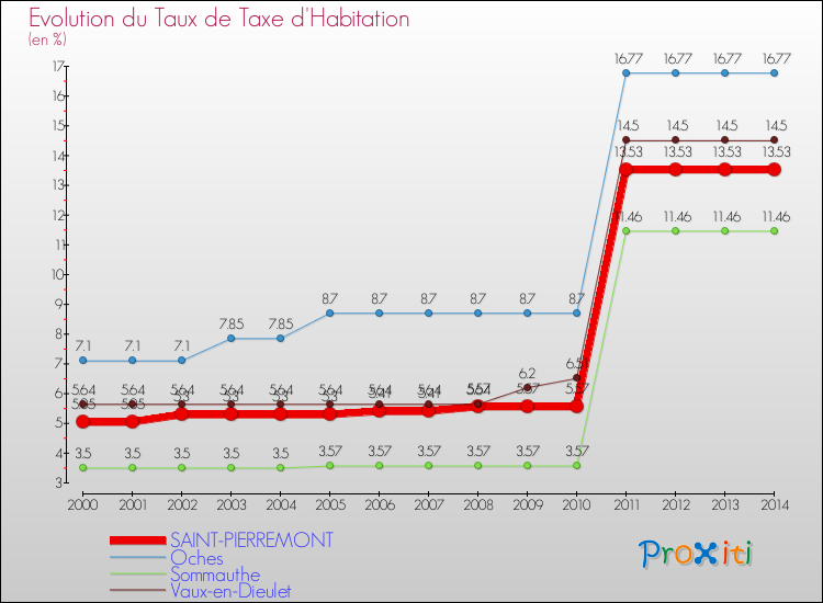 Pendant la même période, les communes françaises similaires à Saint-Pierremont, ont vu leur taux de taxe d'habitation augmenter de 52.01 % en moyenne entre 2000 et 2014.