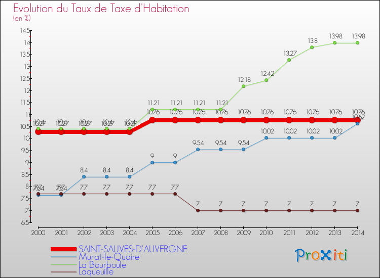 A Saint-Sauves-d'Auvergne, le taux de taxe d'habitation a ainsi augmenté de 4.77 % entre 2000 et 2014.