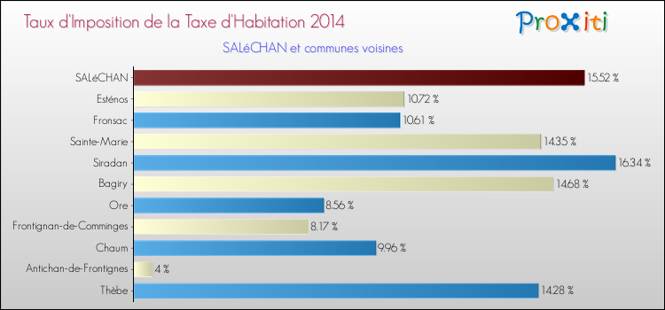 Vous trouverez ci-dessous des graphiques qui vous permettent de situer le taux de la taxe d'habitation de Saléchan par rapport aux communes voisines.