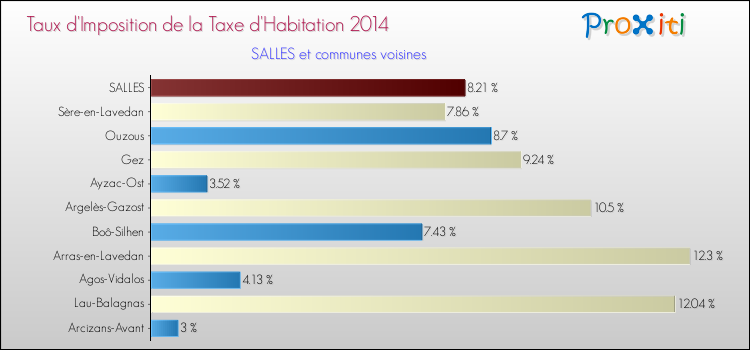 Vous trouverez ci-dessous des graphiques qui vous permettent de situer le taux de la taxe d'habitation de Salles par rapport aux communes voisines.