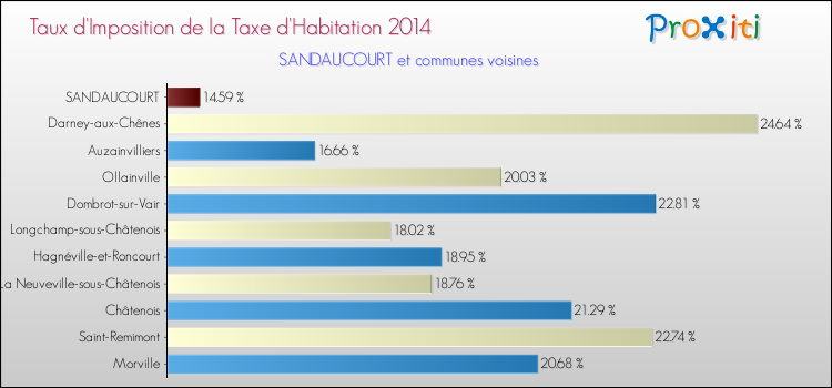 En 2014, le taux de la taxe d'habitation vôté par le conseil municipal de Sandaucourt était de : 14.59 %.