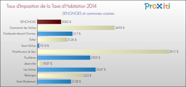 Vous trouverez ci-dessous des graphiques qui vous permettent de situer le taux de la taxe d'habitation de Senonges par rapport aux communes voisines.