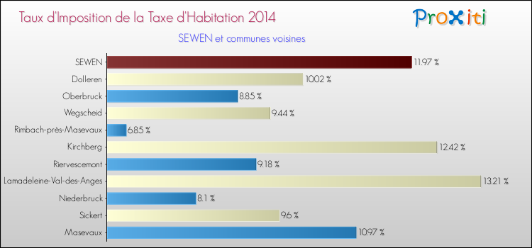 En 2014, le taux de la taxe d'habitation vôté par le conseil municipal de Sewen était de : 11.97 %.