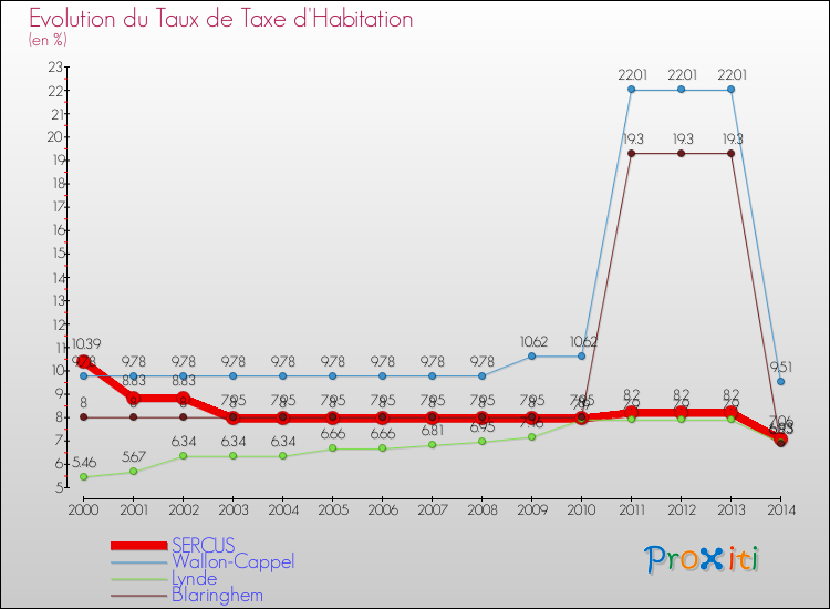 Pendant la même période, les communes françaises similaires à Sercus, ont vu leur taux de taxe d'habitation augmenter de 28.64 % en moyenne entre 2000 et 2014.