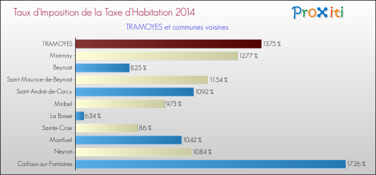 En 2014, le taux de la taxe d'habitation vôté par le conseil municipal de Tramoyes était de : 13.75 %.