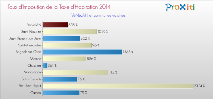 En 2014, le taux de la taxe d'habitation vôté par le conseil municipal de Vénéjan était de : 6.38 %.