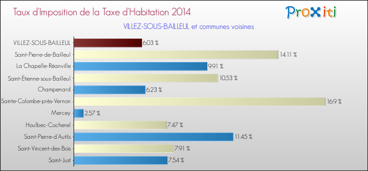 En 2014, le taux de la taxe d'habitation vôté par le conseil municipal de Villez-sous-Bailleul était de : 6.03 %.