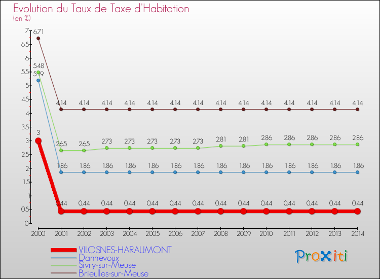 A Vilosnes-Haraumont, le taux de taxe d'habitation a ainsi baissé de 85.33 % entre 2000 et 2014.