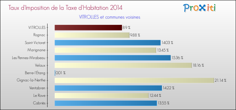 En 2014, le taux de la taxe d'habitation vôté par le conseil municipal de Vitrolles était de : 8.9 %.