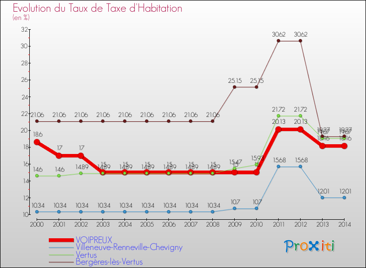 Le graphique ci dessous représente l'évolution du taux de la taxe d'habitation à Voipreux depuis 2000.