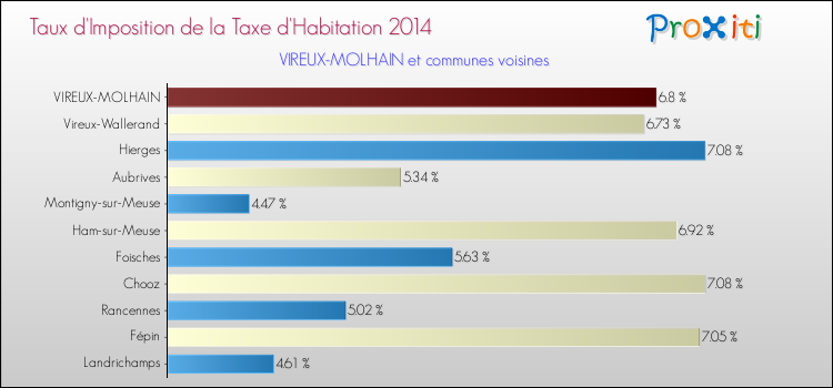 Vous trouverez ci-dessous des graphiques qui vous permettent de situer le taux de la taxe d'habitation de Vireux-Molhain par rapport aux communes voisines.